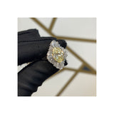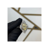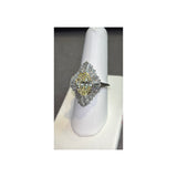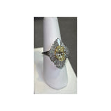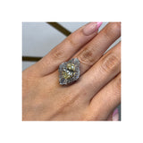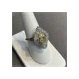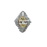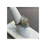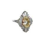 A cocktail ring set with a center oval cut Yellow diamond accented with tapered baguette cut diamonds.