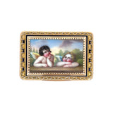 A gold snuff box featuring a rectangular lid consisting of an enamel plaque adorned with depictions of two putto accented with a fine gold zig-zag border and a black enamel frame.