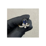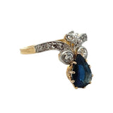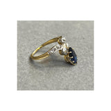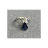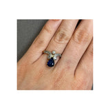 A yellow gold ring set with a pear shaped sapphire and 11 old mine diamonds.