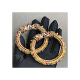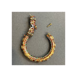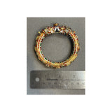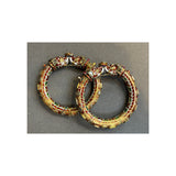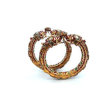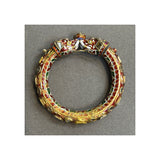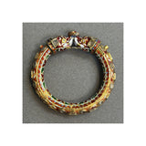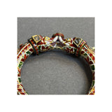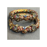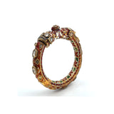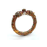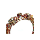 A pair of antique Indian yellow gold bangles from circa 1850s with elephant head motifs. The bangles are set throughout with rose-cut and polki diamonds and decorated with red, white, blue, and green enamel.