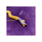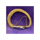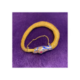 A 14 karat gold mesh bracelet featuring a serpent's head and tail clasp. The snake head is set with blue enamel, diamonds and an oval shaped ruby, while the eyes are each set with a diamond and an amethyst.