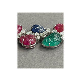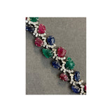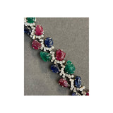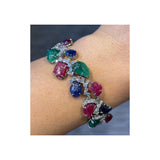 A bracelet set with 24 carved rubies, emeralds, and sapphires accented with 24 baguette-cut diamonds and 72 round-cut diamonds.