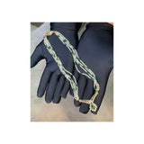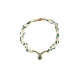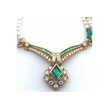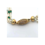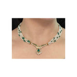 A four-strand necklace with cultured pearls and 135 emerald beads separated with gold spacers. It features a center gold pendant adorned with mixed-cut diamonds and emeralds.