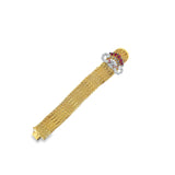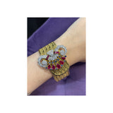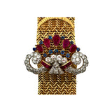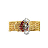 A yellow gold bracelet featuring an ornate motif set with pear-shaped rubies, round-cut sapphires, and round-cut diamonds.