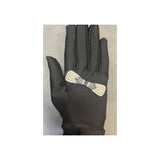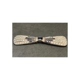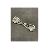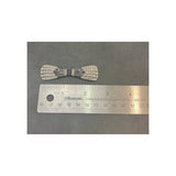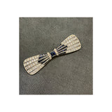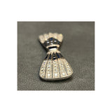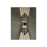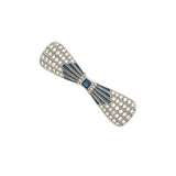 A bow shape brooch featuring a center square cut sapphire set with baguette cut sapphires & round cut diamonds.