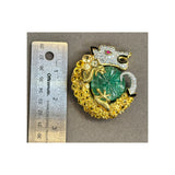A David Webb brooch featuring a dragon protecting a carved emerald. The body is set with yellow sapphires with textured gold details. The head is set with diamonds and accented with black enamel and a pear shaped ruby eye