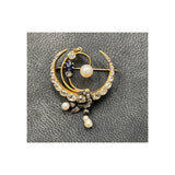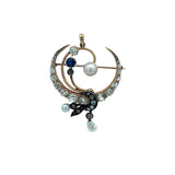 A brooch featuring graduated old mine diamonds, pearls & a round cut sapphire set in a crescent motif. With a dangling pearl at the bottom & a gold bale to be worn as a pendant.