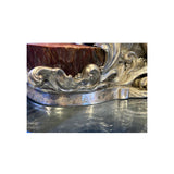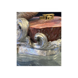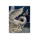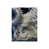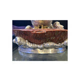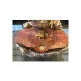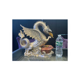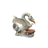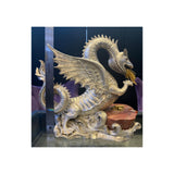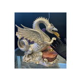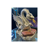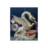 Designed as a fire-breathing dragon, towering over a gilded, pillared building, perched on a hardstone and set upon a scrolled base.