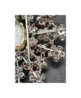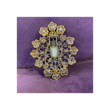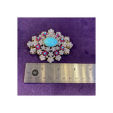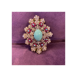 A platinum and 18 karat gold brooch set with a central cabochon turquoise surrounded by 184 brilliant cut diamonds, 40 brilliant cut rubies, and 8 small cabochon turquoises. The diamonds are set in flower motif clusters of 6. The rubies are set in flower motif clusters of 5 with a cabochon turquoise in the center of each. This brooch features a detachable yellow gold frame that allows for versatile wearing options.