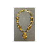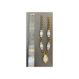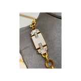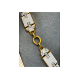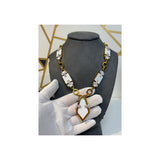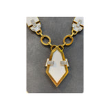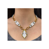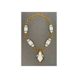 A yellow gold link necklace set with five white geometric enamel panels accented with round diamonds