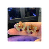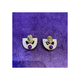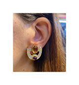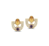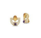 Yellow gold clip on earrings each set with round brilliant cut diamonds, a cabochon citrine, and a cabochon amethyst