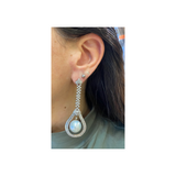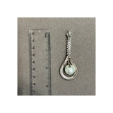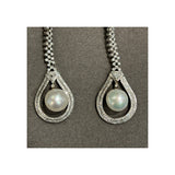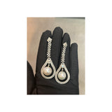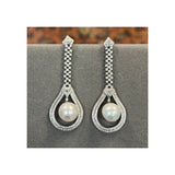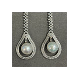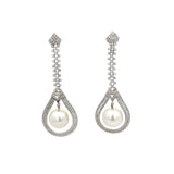 A pair of white gold drop earrings set with two pearl drops accented by round cut diamonds.