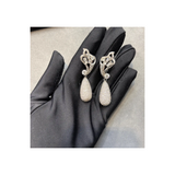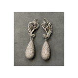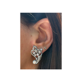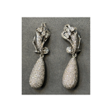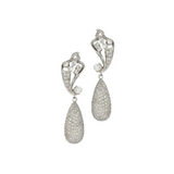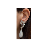A pair of earrings featuring a pave movable drop suspended froma diamond floral motif earring.