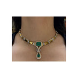 A necklace featuring a center emerald cut emerald with a pear shape dangling emerald accented with round and square cut diamonds.
