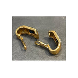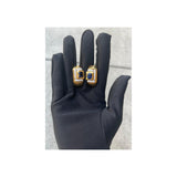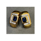 A pair of earrings featuring emerald cut sapphires & surrounded by round cut diamonds set in 18 karat yellow gold.