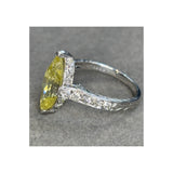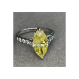 A platinum ring set with a marquise brilliant cut intense yellow cut diamond accented by round cut diamonds.