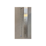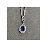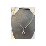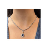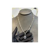 A white gold necklace adorned with round-cut diamonds and a cabochon sapphire.