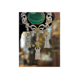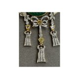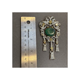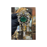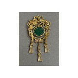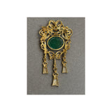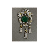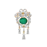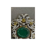 An ornate brooch set with a carved emerald centerpiece, accented with fancy cut colored diamonds and white round cut diamonds. Convertible to be worn as a pendant.