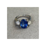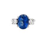A platinum ring centering an oval cut sapphire, flanked by a round cut diamond on each side.