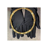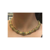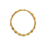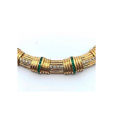 A yellow gold necklace adorned with round-cut diamonds and square cut emeralds.