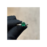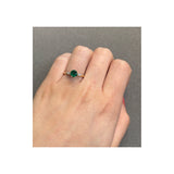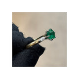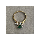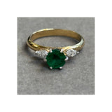 A yellow gold ring set with a round cut emerald flanked by two marquise cut diamonds.