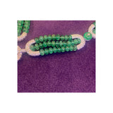 A necklace comprised of three strands of emerald beads with pave diamond links suspending a tassel of five strands of emerald beads.