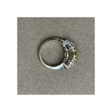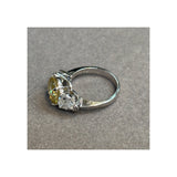 A platinum ring set with a fancy yellow round cut diamond, flanked by two heart-shaped diamonds.