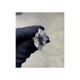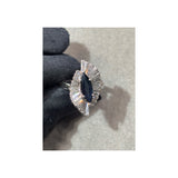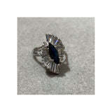 A white gold ballerina ring set with a center marquise cut sapphire, accemnted by 26 baguette cut diamonds,