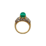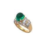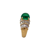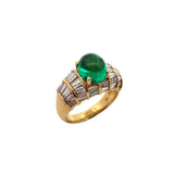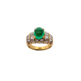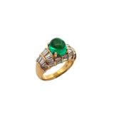 A yellow gold ring adorned with a cabochon emerald and adorned with baguette-cut diamonds.