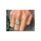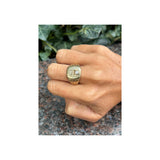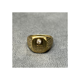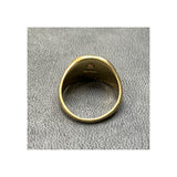 A ring featuring one round cut center diamond, approximately .12 carats, with a dollar sign $ engraving Gram Weight: 10.7 grams