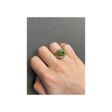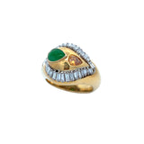 A yellow gold ring set with a pear-shaped diamond of orang tint and a pear-shaped jade, accented by baguette-cut diamonds and a round-cut diamond