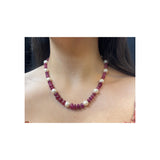 A graduated ruby bead necklace, accented with 15 pearls and spaced throughout with diamond rondelles.