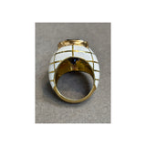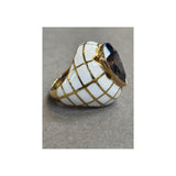 A domed yellow gold ring with white enamel set with a pear shaped sapphire