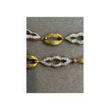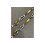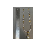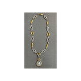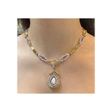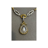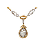 A necklace set with round-cut diamonds on a link chain and a pendant with a pear-shaped pearl drop.