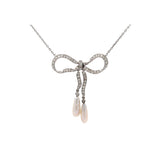 A white gold necklace featuring a bow-shaped pendant set with round-cut diamonds and two dangling pearls.