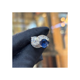 A "You and Me" ring set with a GIA certified cushion cut diamond and an AGL certified sapphire, accented by 12 baguette cut diamonds.