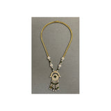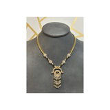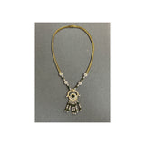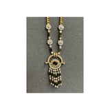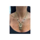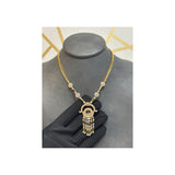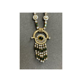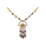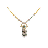 A yellow gold link necklace set with round cut diamonds.. The pendant is set with baguette-cut tourmalines, round-cut diamonds, and a cabochon tourmaline.