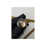 A white gold ring set with a cabochon black star sapphire ring and accented by two round cut diamonds