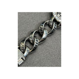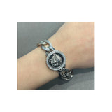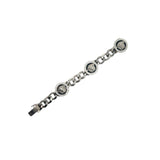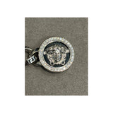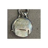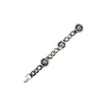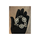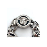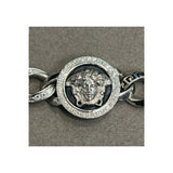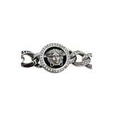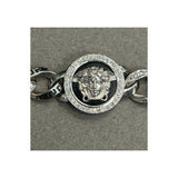 A white gold link bracelet by Versace featuring three Medusa motifs, each accented with a round-cut diamond halo. Some links are engraved with the Versace logo and set with round-cut diamonds.