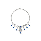 A white gold necklace adorned with approximately 192 round cut diamonds weighing approximately 32 carats and 8 cabochon sapphires.