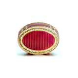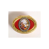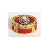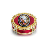 oval, the lid later applied with an oval enamel plaque, representing a young shepherd embracing one of his flock, within a rose-cut diamond frame, the ground of raspberry enamel over scale pattern engine-turning within chased gold garland and husk borders on an opaque white enamel ground, maker's mark, charge and discharge mark of Jean-Baptiste Fouache, Paris date letter for 1775,