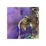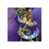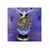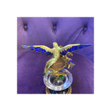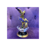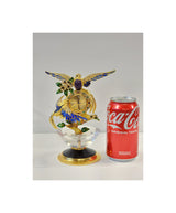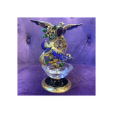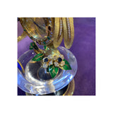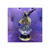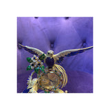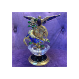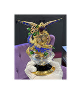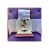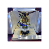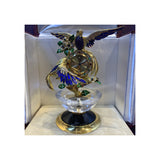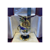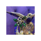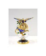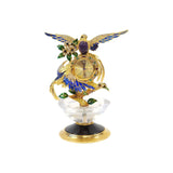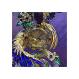 A gold clock set between two birds on a branch, breathtakingly adorned with diamonds, rubies, emeralds, sapphires, amethysts and blue and green enamel. The base consists of rock crystal on onyx and gold.