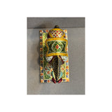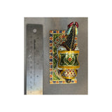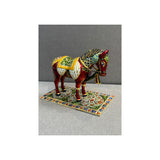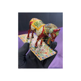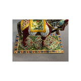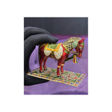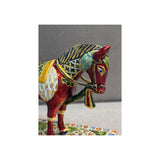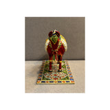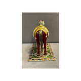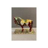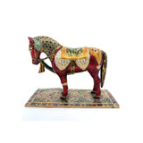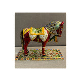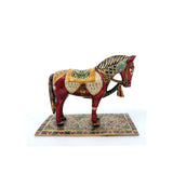 An Indian yellow gold figure of a horse, decorated throughout with multi-colored enamel. The horse is shown standing on an enameled rectangular base with intricate floral and geometric designs, and is fitted with an ornate saddle and harness in red, green, blue, and white enamel.