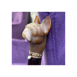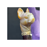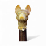 A antique cane featuring a handle shaped as an agate French bulldog, with gold mounted green garnet eyes, a silver gilt studded collar and a small Baroque pearl tag. The handle is set on a snakewood shaft with a metal ferrule.