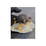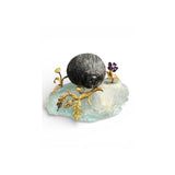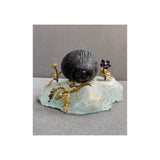 A carved obsidian hedgehog with diamond eyes, resting on a fluorite base, decorated with yellow gold branches, yellow diamond-set acorns, and an amethyst flower, by Verdura.