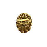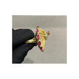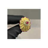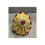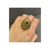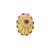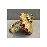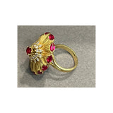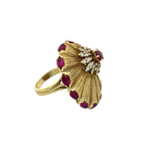 A yellow gold disc-shaped cocktail ring featuring a textured sunburst design, accented with marquise-cut rubies along the border. At the center, a round-cut ruby is surrounded by round cut diamonds.