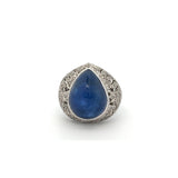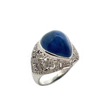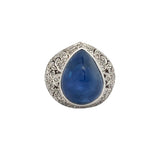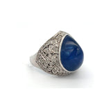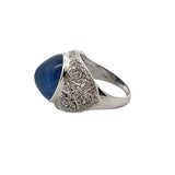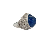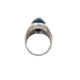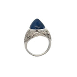 A white gold ring set with a tall cabochon sapphire accented by diamonds.