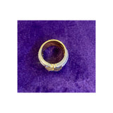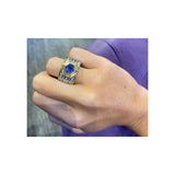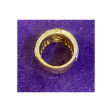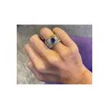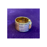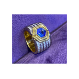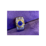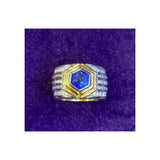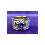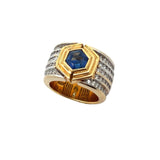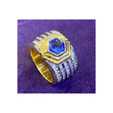 A band consisting of a center hexagon cut sapphire with five rows of round cut diamonds.