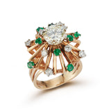 1 round cut center diamond approximately 1.55 cts surrounded by round cut emeralds and diamonds