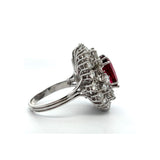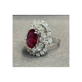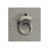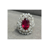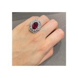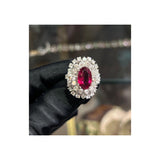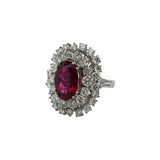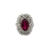 A platinum ring set with an oval rubellite and 38 brilliant round cut diamonds.
